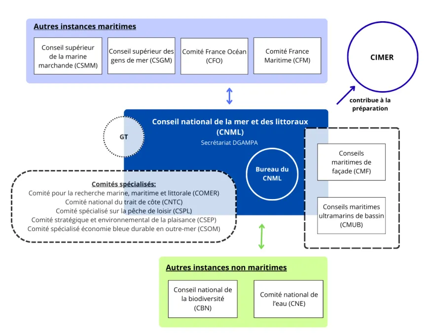 Le CNML travaille en lien étroit avec les principales instances consultatives compétentes dans le cadre de la politique intégrée de la mer et du littoral (Comité France Océan, Comité France Maritime, Conseil supérieur de la marine marchande, Conseil supérieur des gens de mer). Il joue un rôle d’animation des conseils maritimes de façade (CMF) et des conseils maritimes ultramarin de bassin (CMUB). Il veille dans ce cadre à la cohérence des politiques maritimes locales avec la politique nationale pour la mer et les littoraux.