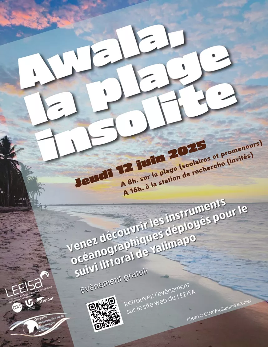 Dans le sillage d'une opération scientifique visant à déployer divers instruments océanographiques sur la plage d'Awala-Yalimapo les 11-12 et 13 juin (projet OHLTIM), l'équipe scientifique souhaite organiser une action de vulgarisation de proximité, sur la plage et sur la station de recherche de l'ouest guyanais.