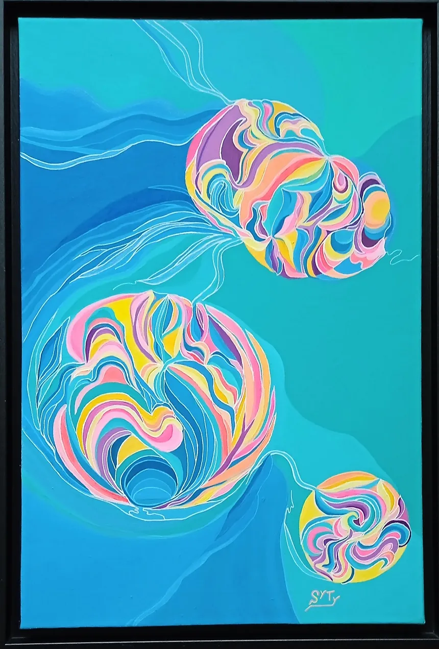 Le phytoplancton produit 50 % de l’oxygène terrestre, régule le climat et constitue la base de la chaine alimentaire océanique. Fragilisé par le réchauffement et la pollution des océans, il inspire ma série « Le Ballet des Invisibles ». Mes œuvres colorées rendent hommage à cette beauté invisible et au lien entre l’infiniment petit et l'équilibre global de notre planète.
