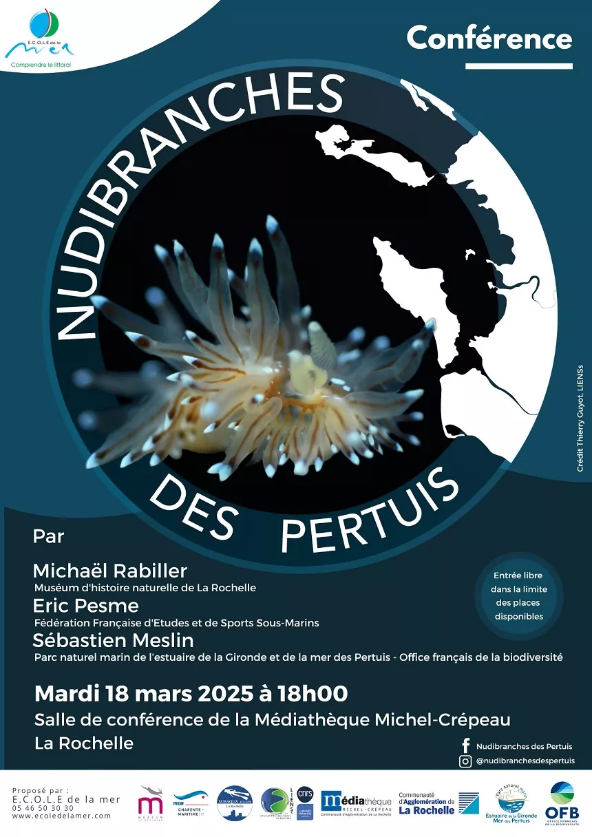 Cette conférence vous invite à découvrir les nudibranches qui vivent dans la mer des Pertuis et le programme de sciences participatives en cours pour réactualiser la liste des espèces présentes. En effet, de nombreuses espèces de ces "limaces de mer" y sont observées avec leur variété de formes et de couleurs : une véritable plongée visuelle à la découverte de ces mollusques.