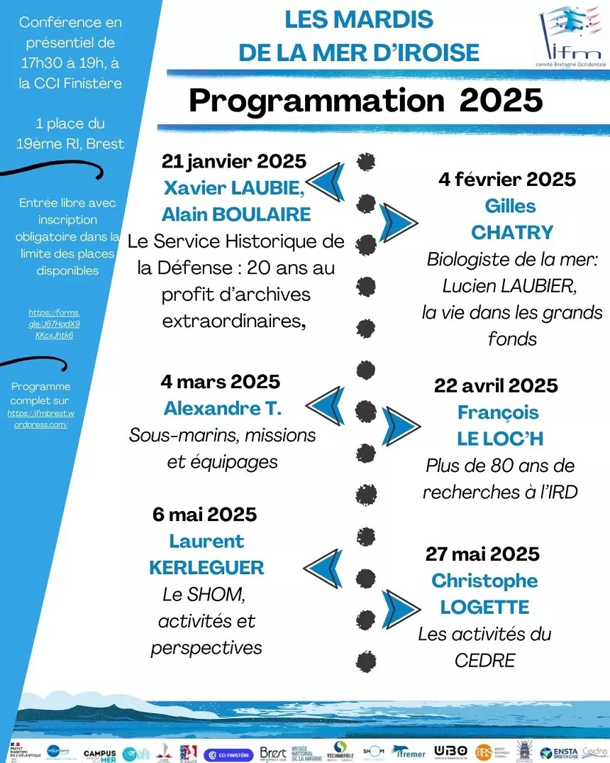 Tout au long de l’année, le Comité de Bretagne occidentale de l’Institut Français de la Mer propose un cycle de conférences avec programmation riche et diversifiée :
