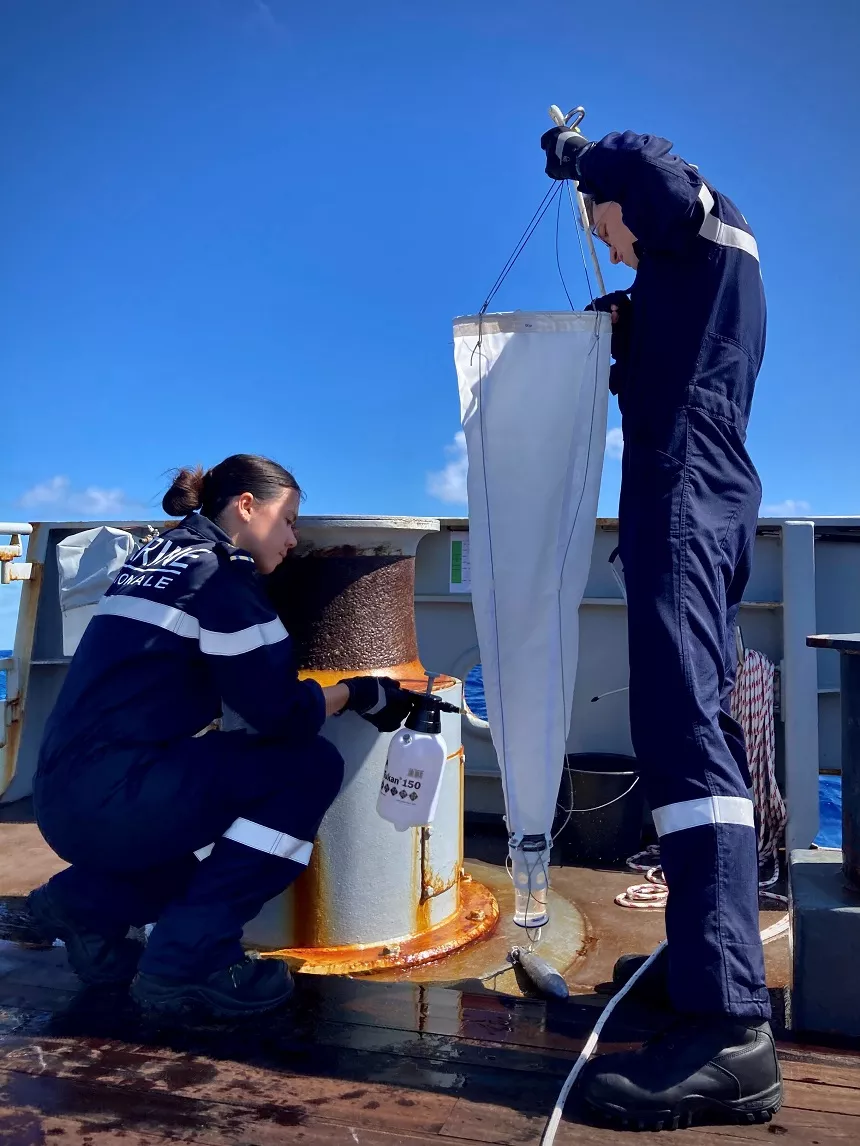 Chaque année, 4 à 6 étudiants en Master de Sorbonne Université embarquent sur les bâtiments de la Marine nationale à La Réunion, en Nouvelle-Calédonie et en Polynésie française pour étudier le microbiome océanique à l'aide de capteurs peu coûteux et partager leurs travaux auprès des scolaires et du grand public.
